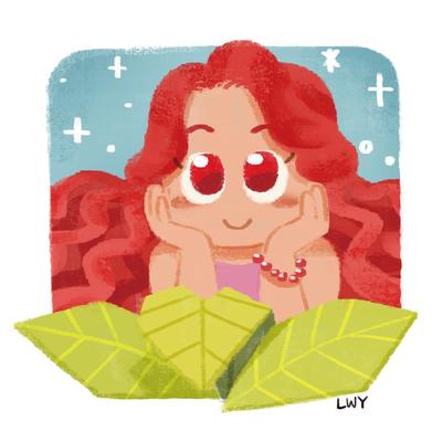 Original high-quality artwork of a cute girl with wavy long red hair, peeking out of some large tree leaves.Product: Unframed, paper onlySize: 5.8x5.8 inch (148x148 mm)Paper Finishing: MattePaper Weight: 220 gsm